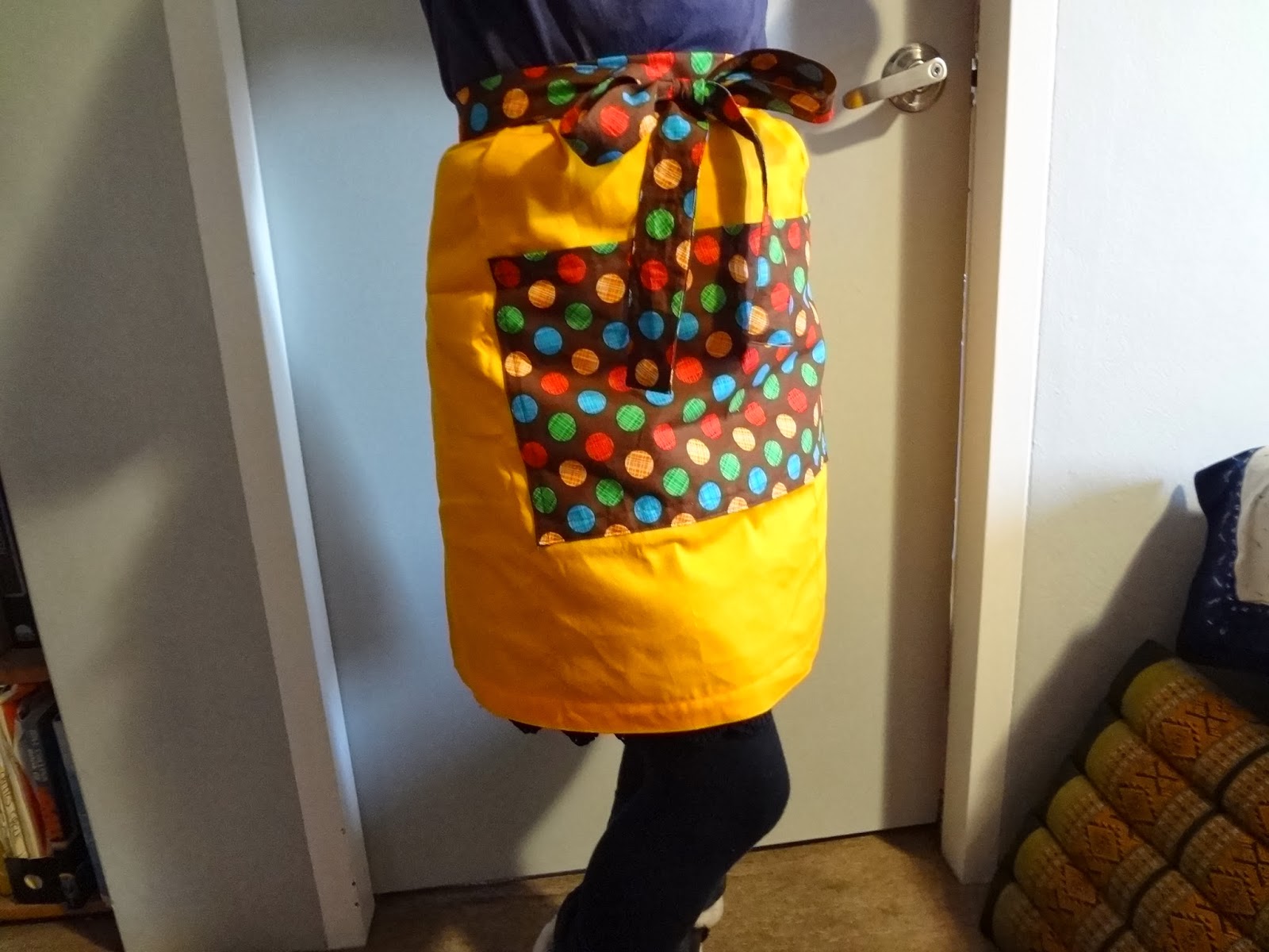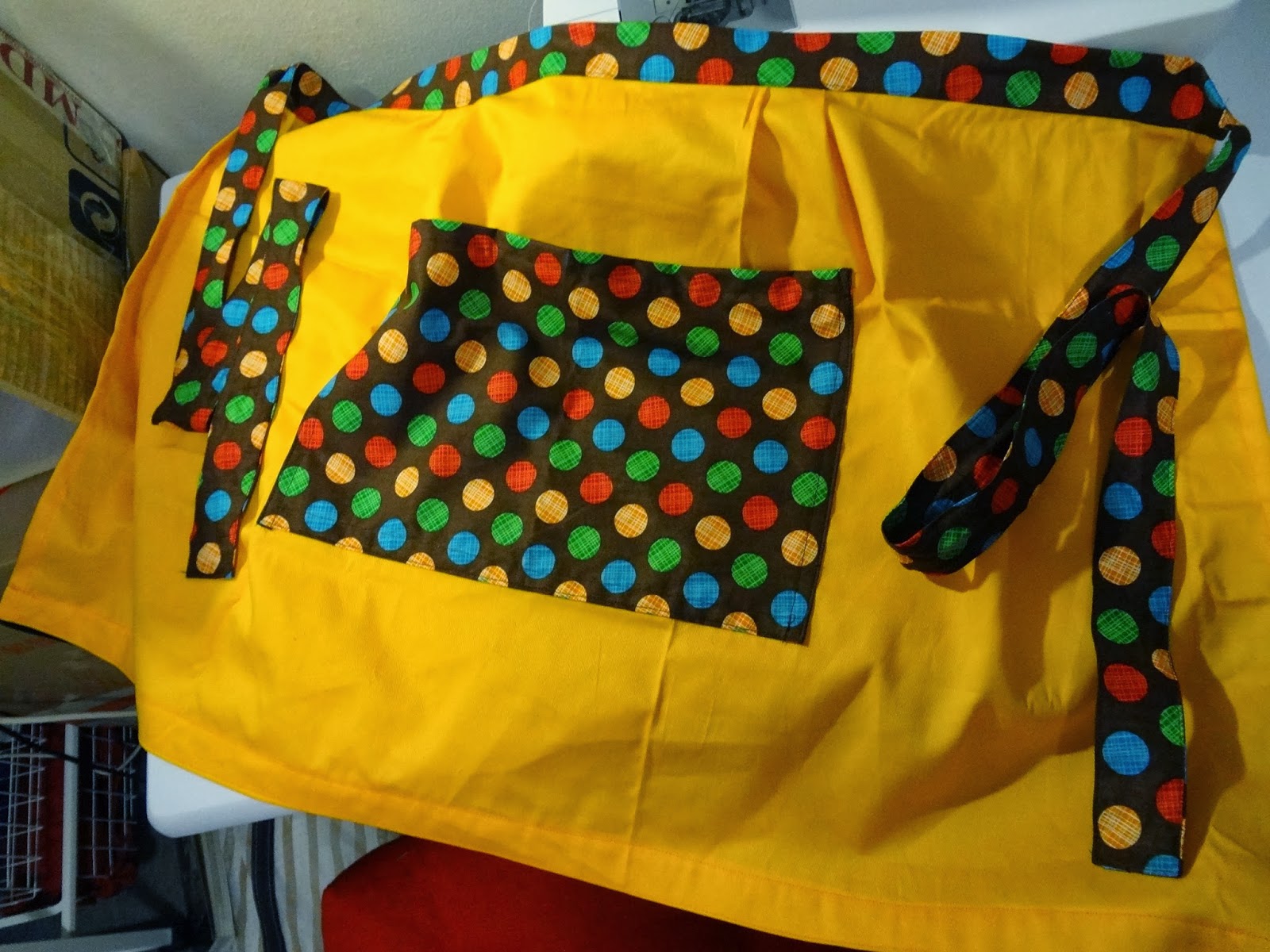 Using the fabrics I already had at home, I made several colour combination samples to show Venessa. (I personally like the third one with the mustard colour). As the dress material already has a lot of fun colours and patterns on itself, I would think that apron strings and a pocket needs a plain coloured fabric–Otherwise, the apron might look “too noisy”.