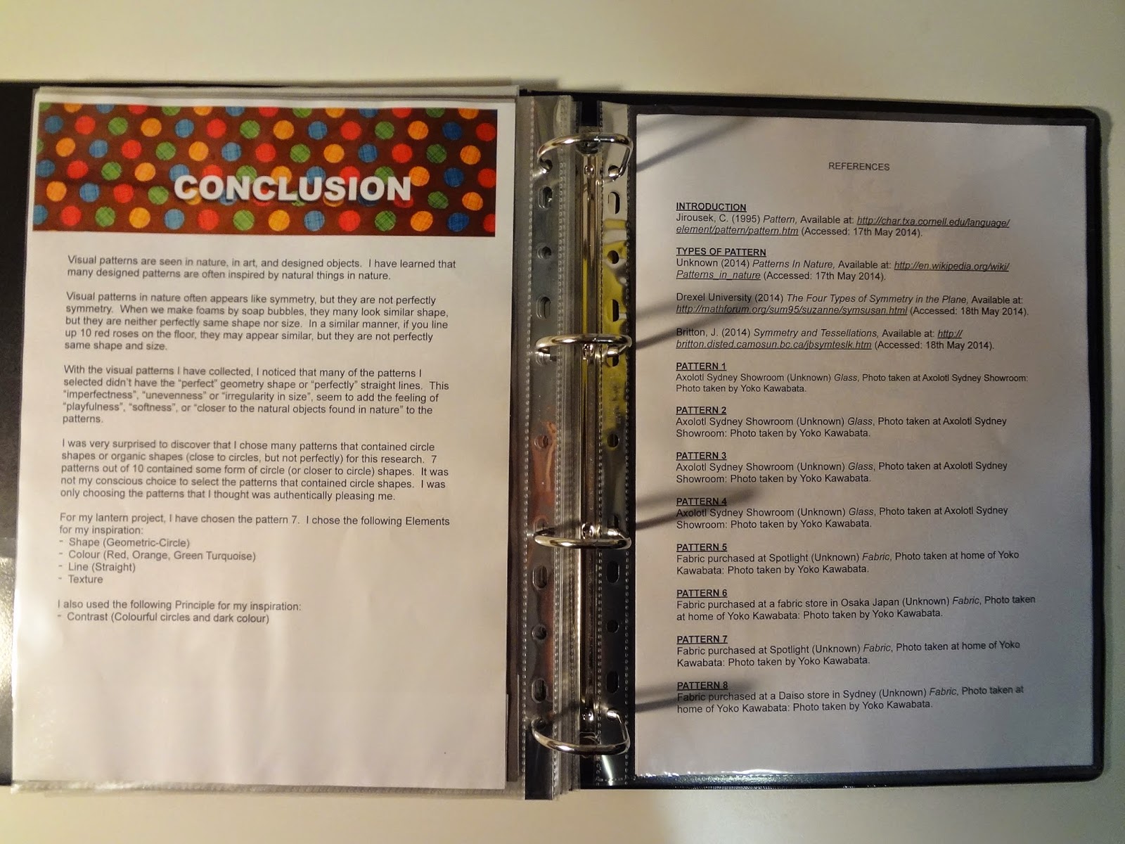 [From brief] “You are to prepare a report about the design principle of ‘pattern’ by researching and analysing examples of visual patterns in the decorative arts and design. You will research various sources and select a minimum of 10 diverse examples of visual patterns that demonstrate different aspects of pattern design and construction….”