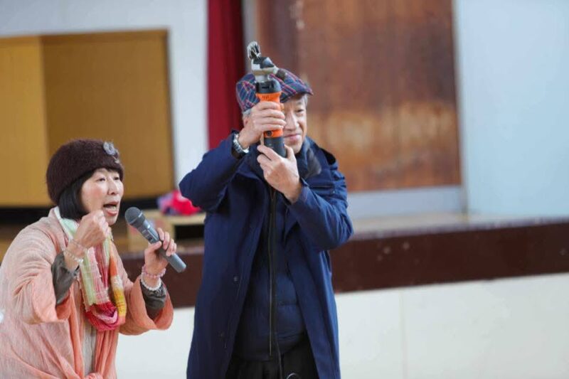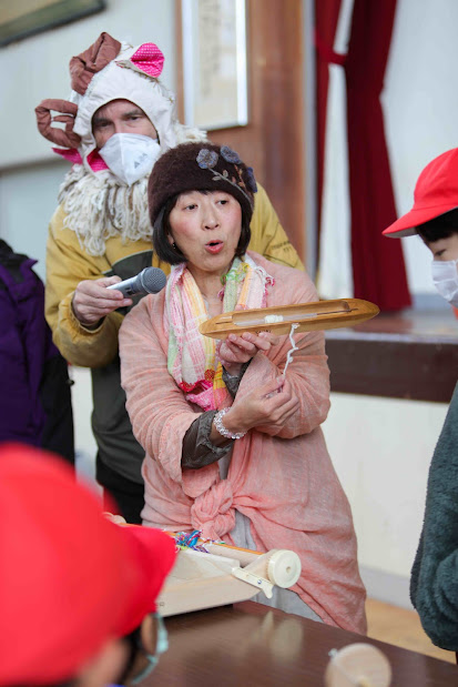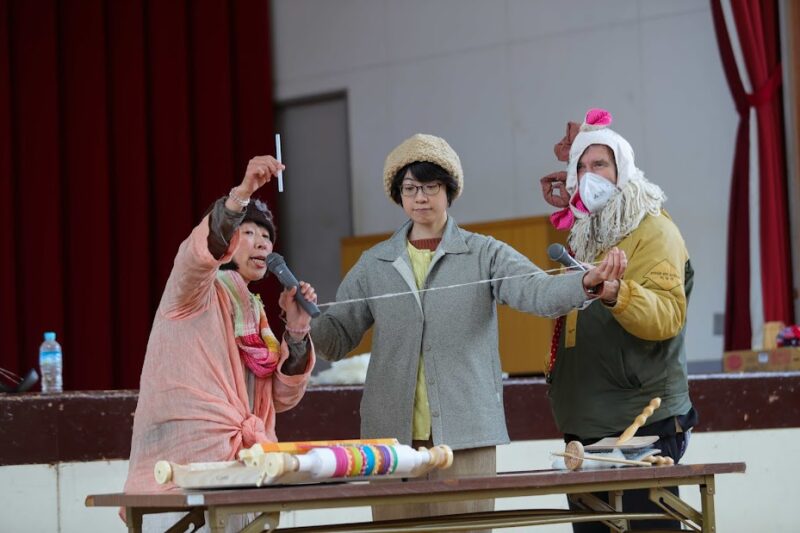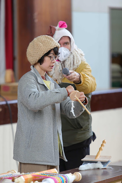 Performed a skit to introduce sustainable craftsmanship in textile production. We showed the process of [Shearing sheep → Carding & spinning wool → Weaving handspan wool yarn → Demonstrated handspan & handwoven wool jacket → Biodegradable materials that return to the earth → Happy sheep eating the grass in the fertile soil]. / 地球に優しく循環する布づくりを寸劇で紹介:【羊の毛を刈る→羊毛を整えて手紡ぎ→糸を手織り→手紡ぎ&手織りした生地で仕立てたウールジャケットを紹介→土に還る天然素材の説明→豊かな土壌に育つ牧草を食べて幸せな羊が育つ循環のある世界】