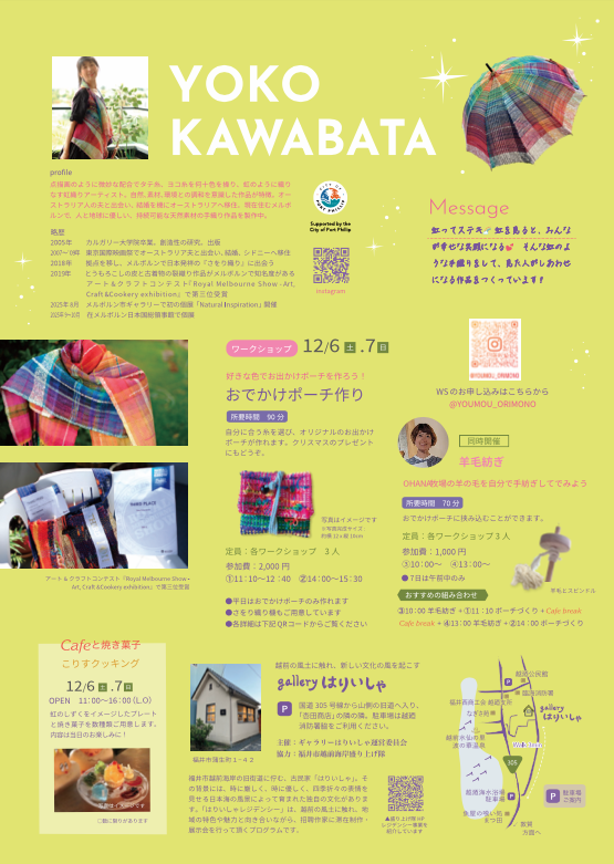 FUKUI YOGASA UMBRELLA, ARAI SILK, TAKASU OHANA SHEEP FARM, mikyuuuuuu, bearknot_in_kyoto, Coris Cooking, Atsuko Susuki, Naoko Osano, HARIISHA GALLERY and many others.