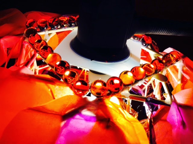 あと、赤・紫・オレンジのセロファンも、同じように丸くカット。そしてグルーガンでくっつけていきます。
